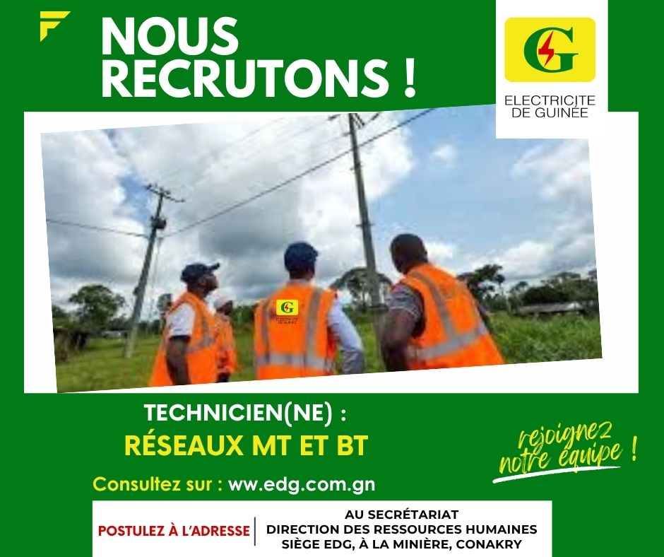 • novembre 6, 2025AVIS DE RECRUTEMENT TECHNICIEN(NE) RÉSEAUX MT ET BT_PROJET 40MW KANKAN